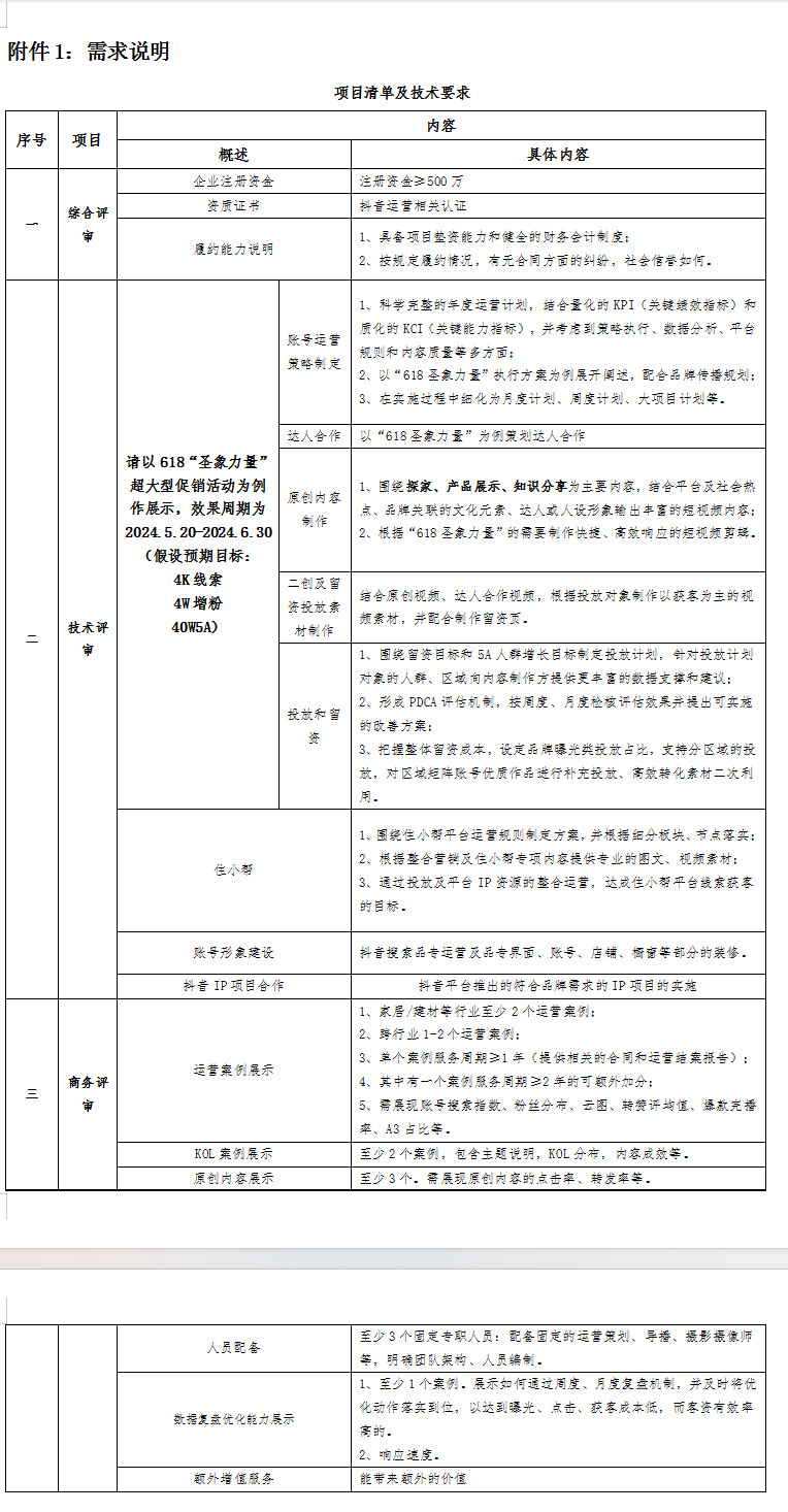為全面貫徹“擴(kuò)口碑、提升量、優(yōu)品質(zhì)、促轉(zhuǎn)化”的方針,打通全鏈路用戶生命周期,圣象決定對圣象品牌數(shù)字營銷2024年度運(yùn)營服務(wù)項(xiàng)目(項(xiàng)目名稱)進(jìn)行公開招標(biāo),特邀請有興趣的潛在投標(biāo)人(以下簡稱申請人)提出資格預(yù)審申請。