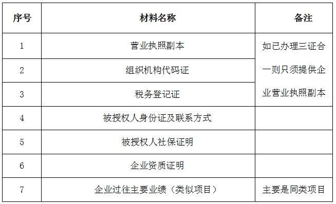2、 凡有意向參加投標(biāo)者,請在上述期間內(nèi)按下表提供報名資料,相關(guān)證明文件的原件如無法提供原件則提供復(fù)印件加蓋公司公章,投標(biāo)人須將上述資料的掃描件發(fā)郵件至招標(biāo)聯(lián)系人處進行報名。