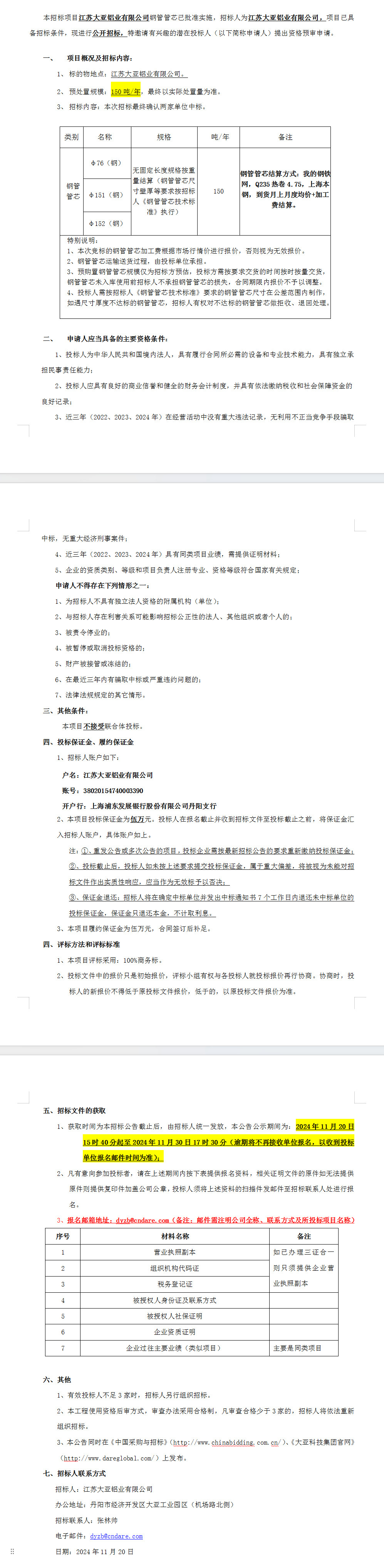 江蘇大亞鋁業(yè)有限公司鋼管管芯招標(biāo)公告