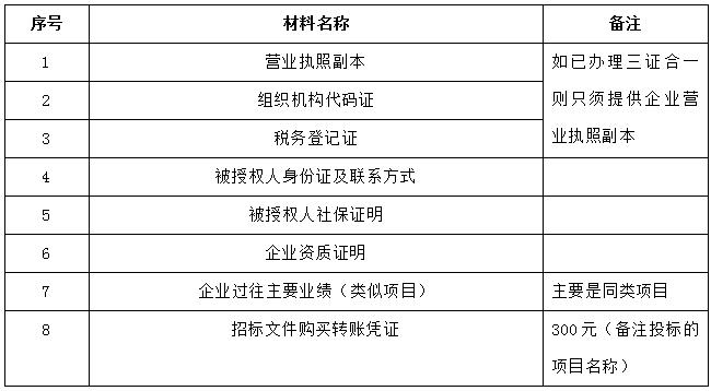 2、 凡有意向參加投標(biāo)者,請在上述期間內(nèi)按下表提供報名資料,相關(guān)證明文件的原件如無法提供原件則提供復(fù)印件加蓋公司公章,投標(biāo)人須將上述資料的掃描件發(fā)郵件至招標(biāo)聯(lián)系人處進(jìn)行報名。