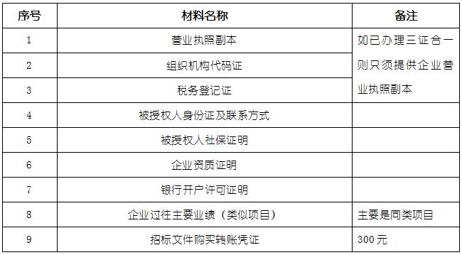 2、 凡有意向參加投標(biāo)者,請在上述期間內(nèi)按下表提供報名資料,相關(guān)證明文件的原件如無法提供原件則提供復(fù)印件加蓋公司公章,投標(biāo)人須將上述資料的掃描件發(fā)郵件至招標(biāo)聯(lián)系人處進(jìn)行報名。