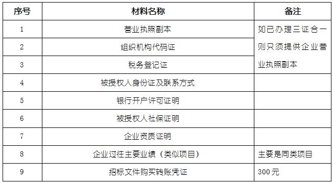 2、 凡有意向參加投標者,請在上述期間內(nèi)按下表提供報名資料,相關(guān)證明文件的原件如無法提供原件則提供復(fù)印件加蓋公司公章,投標人須將上述資料的掃描件發(fā)郵件至招標聯(lián)系人處進行報名。