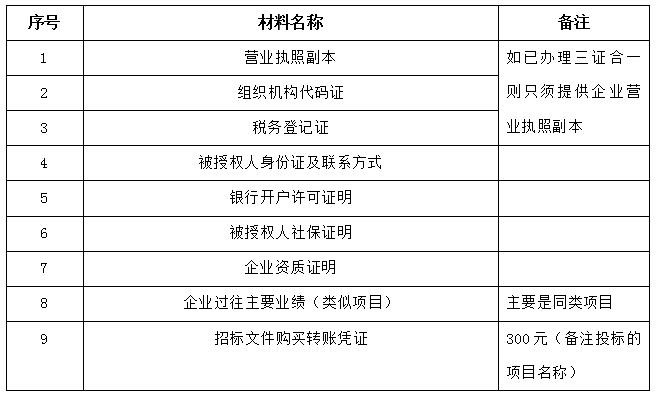 2、 凡有意向參加投標(biāo)者,請(qǐng)?jiān)谏鲜銎陂g內(nèi)按下表提供報(bào)名資料,相關(guān)證明文件的原件如無法提供原件則提供復(fù)印件加蓋公司公章,投標(biāo)人須將上述資料的掃描件發(fā)郵件至招標(biāo)聯(lián)系人處進(jìn)行報(bào)名。