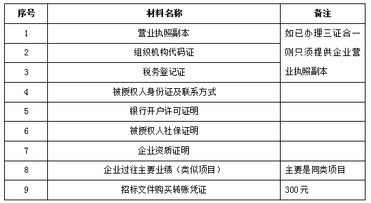 2、 凡有意向參加投標(biāo)者,請?jiān)谏鲜銎陂g內(nèi)按下表提供報名資料,相關(guān)證明文件的原件如無法提供原件則提供復(fù)印件加蓋公司公章,投標(biāo)人須將上述資料的掃描件發(fā)郵件至招標(biāo)聯(lián)系人處進(jìn)行報名。