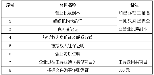 2、 凡有意向參加投標(biāo)者,請?jiān)谏鲜銎陂g內(nèi)按下表提供報名資料,相關(guān)證明文件的原件如無法提供原件則提供復(fù)印件加蓋公司公章,投標(biāo)人須將上述資料的掃描件發(fā)郵件至招標(biāo)聯(lián)系人處進(jìn)行報名。