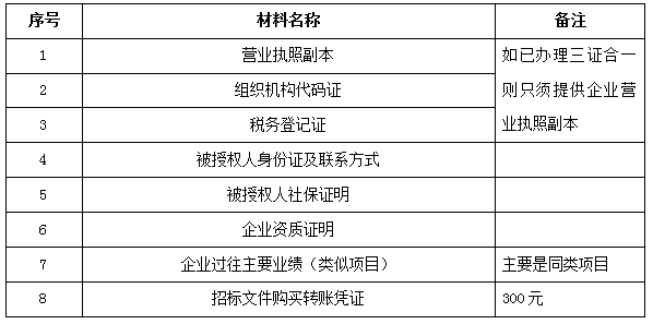 2、 凡有意向參加投標(biāo)者,請(qǐng)?jiān)谏鲜銎陂g內(nèi)按下表提供報(bào)名資料,相關(guān)證明文件的原件如無法提供原件則提供復(fù)印件加蓋公司公章,投標(biāo)人須將上述資料的掃描件發(fā)郵件至招標(biāo)聯(lián)系人處進(jìn)行報(bào)名。