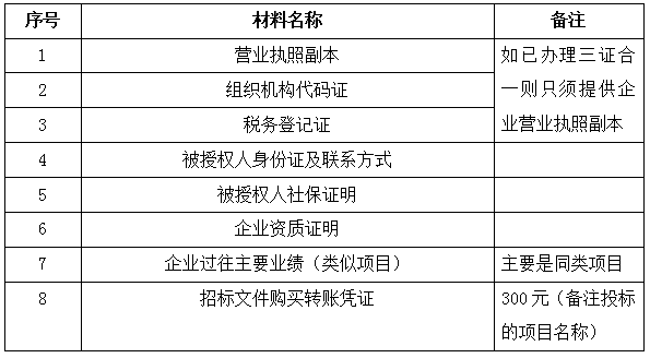 2、凡有意向參加投標者,請在上述期間內(nèi)按下表提供報名資料,相關(guān)證明文件的原件如無法提供原件則提供復印件加蓋公司公章,投標人須將上述資料的掃描件發(fā)郵件至招標聯(lián)系人處進行報名。