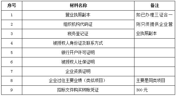 2、 凡有意向參加投標(biāo)者,請(qǐng)?jiān)谏鲜銎陂g內(nèi)按下表提供報(bào)名資料,相關(guān)證明文件的原件如無法提供原件則提供復(fù)印件加蓋公司公章,投標(biāo)人須將上述資料的掃描件發(fā)郵件至招標(biāo)聯(lián)系人處進(jìn)行報(bào)名。