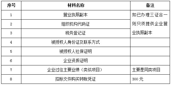 2、 凡有意向參加投標(biāo)者,請(qǐng)?jiān)谏鲜銎陂g內(nèi)按下表提供報(bào)名資料,相關(guān)證明文件的原件如無法提供原件則提供復(fù)印件加蓋公司公章,投標(biāo)人須將上述資料的掃描件發(fā)郵件至招標(biāo)聯(lián)系人處進(jìn)行報(bào)名。
