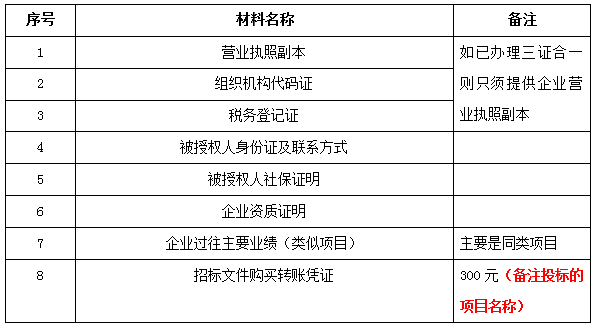 2、 凡有意向參加投標(biāo)者,請在上述期間內(nèi)按下表提供報名資料,相關(guān)證明文件的原件如無法提供原件則提供復(fù)印件加蓋公司公章,投標(biāo)人須將上述資料的掃描件發(fā)郵件至招標(biāo)聯(lián)系人處進(jìn)行報名。