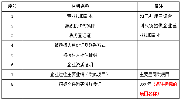 2、 凡有意向參加投標者,請在上述期間內(nèi)按下表提供報名資料,相關(guān)證明文件的原件如無法提供原件則提供復(fù)印件加蓋公司公章,投標人須將上述資料的掃描件發(fā)郵件至招標聯(lián)系人處進行報名。