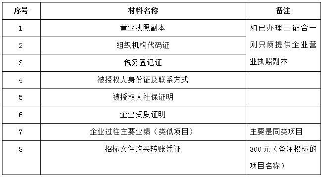 2、 凡有意向參加投標(biāo)者,請?jiān)谏鲜銎陂g內(nèi)按下表提供報(bào)名資料,相關(guān)證明文件的原件如無法提供原件則提供復(fù)印件加蓋公司公章,投標(biāo)人須將上述資料的掃描件發(fā)郵件至招標(biāo)聯(lián)系人處進(jìn)行報(bào)名。