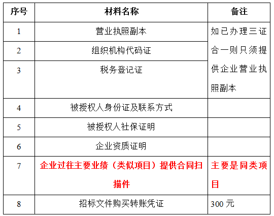 2、 凡有意向參加投標(biāo)者,請(qǐng)?jiān)谏鲜銎陂g內(nèi)按下表提供報(bào)名資料,相關(guān)證明文件的原件如無(wú)法提供原件則提供復(fù)印件加蓋公司公章,投標(biāo)人須將上述資料的掃描件發(fā)郵件至招標(biāo)聯(lián)系人處進(jìn)行報(bào)名。
