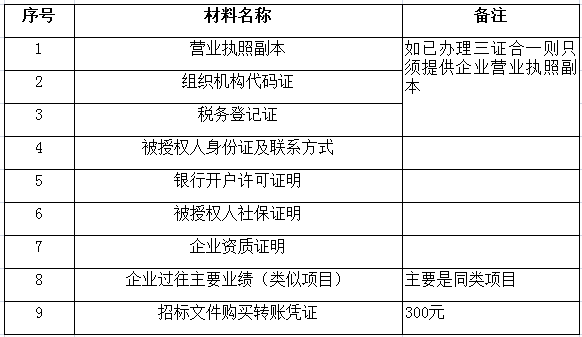 3、 凡有意向參加投標(biāo)者,請(qǐng)?jiān)谏鲜銎陂g內(nèi)按下表提供報(bào)名資料,相關(guān)證明文件的原件如無法提供原件則提供復(fù)印件加蓋公司公章,投標(biāo)人須將上述資料的掃描件發(fā)郵件至招標(biāo)聯(lián)系人處進(jìn)行報(bào)名。