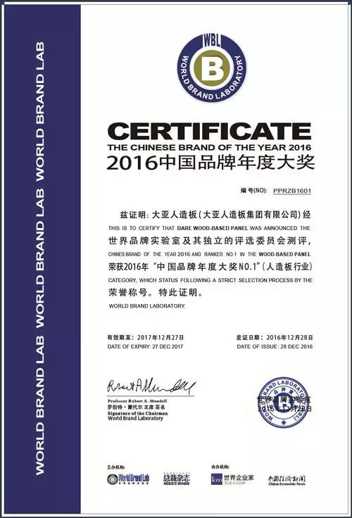 由世界經(jīng)理人集團(tuán) (icxo.com) 、世界品牌實(shí)驗(yàn)室、《世界企業(yè)家》、《總裁》雜志、世界媒體實(shí)驗(yàn)室聯(lián)合主辦的“總裁世界年會(huì)”于2016年12月28日在北京隆重召開,會(huì)上發(fā)布了2016年度的“中國(guó)品牌年度大獎(jiǎng)”、“中國(guó)經(jīng)濟(jì)年度風(fēng)云人物”、“五星鉆石獎(jiǎng)”及"世界媒體500強(qiáng)"等獎(jiǎng)項(xiàng)。鑒于大亞人造板市場(chǎng)知名度、美譽(yù)度、偏好度、創(chuàng)新力及多年來在中國(guó)行業(yè)里的地位和影響力,經(jīng)世界品牌實(shí)驗(yàn)室及其獨(dú)立的評(píng)選委員會(huì)測(cè)評(píng),授予大亞人造板(大亞人造板集團(tuán)有限公司)2016年“中國(guó)品牌年度大獎(jiǎng)NO.1”(人造板行業(yè))榮譽(yù)稱號(hào)。大亞人造板集團(tuán)副總裁仲宏年代表集團(tuán)接受榮譽(yù)獎(jiǎng)牌。