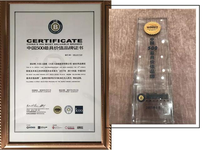 6月22日,由國(guó)際權(quán)威品牌評(píng)審機(jī)構(gòu)——世界品牌實(shí)驗(yàn)室(World Brand Lab)主辦的“世界品牌大會(huì)”暨“2017年(第十四屆)中國(guó)500最具價(jià)值品牌”發(fā)布會(huì)在北京舉行,會(huì)上發(fā)布了2017 年“中國(guó)500 最具價(jià)值品牌”排行榜。在這份基于財(cái)務(wù)數(shù)據(jù)、品牌強(qiáng)度和消費(fèi)者行為分析的年度報(bào)告中,大亞人造板以108.36億元人民幣的品牌價(jià)值榮登人造板行業(yè)榜首!