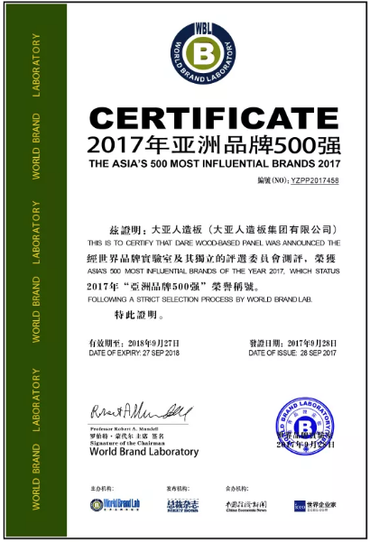 由世界品牌實(shí)驗(yàn)室和世界經(jīng)理人集團(tuán)共同編制和發(fā)布的2017年《亞洲品牌500強(qiáng)》排行榜于9月28日在香港揭曉,這是世界品牌實(shí)驗(yàn)室第十二次對亞洲品牌的影響力進(jìn)行的測評(píng), 共有20個(gè)國家和地區(qū)的500個(gè)品牌入選,中國、日本和韓國是入選品牌最多的三個(gè)國家?!秮喼奁放?00強(qiáng)》的評(píng)判標(biāo)準(zhǔn)是品牌的亞洲影響力,品牌影響力是指品牌開拓市場、占領(lǐng)市場、并獲得利潤的能力。大亞人造板憑借在人造板行業(yè)多年的領(lǐng)導(dǎo)力、市場占有率和品牌忠誠度成功入選《亞洲品牌500強(qiáng)》!