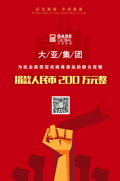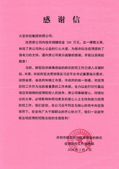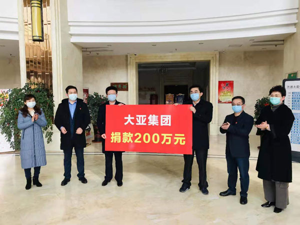 新型冠狀病毒感染的肺炎疫情發(fā)生以來(lái),大亞集團(tuán)密切關(guān)注疫情動(dòng)態(tài),緊急啟動(dòng)關(guān)于抗擊疫情的一系列行動(dòng)舉措。2月5日,大亞集團(tuán)在圣象集團(tuán)向中國(guó)紅十字基金總會(huì)捐款200萬(wàn)元的基礎(chǔ)上,再次出手定向捐款丹陽(yáng)市疫情防控工作指揮部200萬(wàn)元,用于新冠肺炎疫情防疫抗擊工作。
