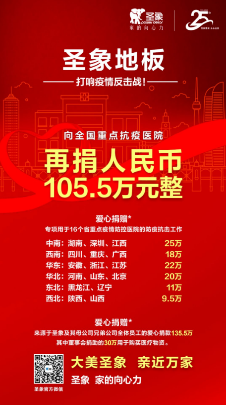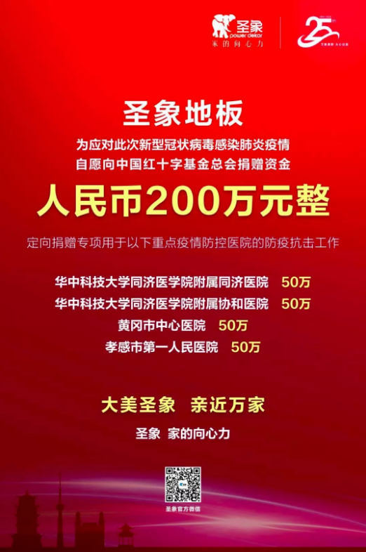 新冠疫情爆發(fā)的第一時(shí)間,圣象集團(tuán)心系前線(xiàn)醫(yī)護(hù)人員、心系疫區(qū)人民,同時(shí)也謹(jǐn)記肩負(fù)社會(huì)責(zé)任,以企業(yè)名義主動(dòng)聯(lián)系到了中國(guó)紅十字基金會(huì),2月3日決定一次性捐款200萬(wàn)元整人民幣,定向捐助湖北一線(xiàn)受疫情影響最嚴(yán)重四家醫(yī)院,希望共同渡過(guò)難關(guān),帶給一線(xiàn)醫(yī)生更充足的防護(hù)資源!