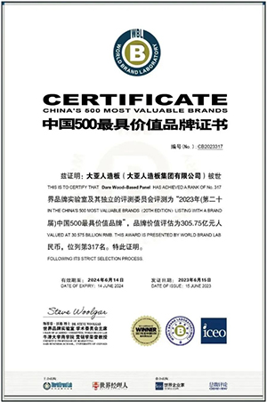 2023年,大亞人造板以305.75億元品牌價(jià)值蟬聯(lián)中國人造板行業(yè)榜首,價(jià)值增幅33.6%!品牌排名317位,第六次榮登最具價(jià)值品牌(人造板行業(yè))榜首!